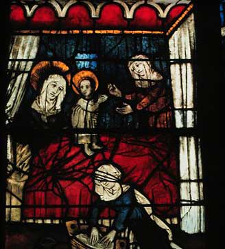 Zwei Hebammen kümmern sich um die Heilige Anna. Eine von ihnen bereitet das Bad für Maria vor