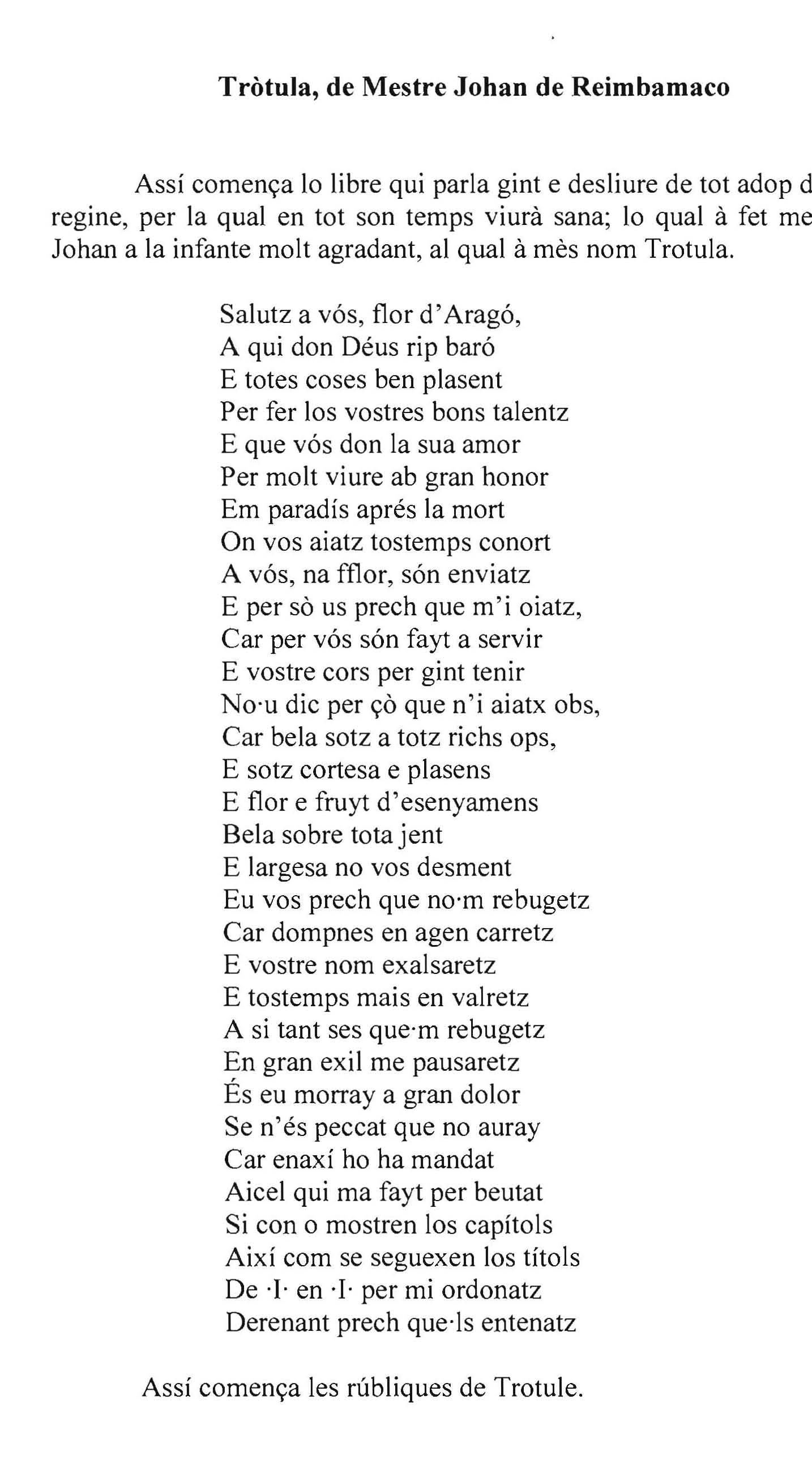 Hi ha un gènere de literatura mèdica, que prové de la tradició i l’estudi de la medicina greco-llatina i àrab, destinat a la cura del cos femení. Aquests textos van circular a partir del segle XI per Europa i que es van traduir a les diferents llengües vernacles per la seva popularitat. Es conserva, a la Biblioteca de Catalunya, un manuscrit datat del segle XV anomenat Trotula del mestre Johan de Reimbamaco. El manuscrit fa referència a una traducció al català, probablement del llatí, d’una compilació de tractats que es basen en el conjunt de textos atribuïts a Trota o Tròtula, metgessa de Salern del segle XI, que va escriure una obra mèdica-ginecològica. El mestre Johan fa un compendi traduïnt diversos fragments, de dos dels tractats de l’obra de Trota, De ornatu i De curis milierum, i que conclou amb un règim de sanitat, i és anomenat Tròtula catalana. El manuscrit està dedicat a una dona en concret, la reina Maria, muller d’Alfons el Magnànim, a la qual l’autor descriurà, en la dedicació del manuscrit, com a regina, flor d’Aragó i bela, remarcant la seva bellesa. La reina com les dones de la seva cort usaven maquillatge i el manuscrit ofereix remeis per al guariment i per al manteniment de la salut i la bellesa de les dones, tant nobles com burgeses, que aprenien a llegir així en llengua catalana, a la Catalunya baix medieval. Remeis tant diversos com fer créixer o tenyir els cabells, aclarir la pell de la cara tornant-la blanca, tenir les dents blanques i sanes, etcètera. Però, qui fou Trota o Tròtula? Va ser una tractadista i experta en medicina de l’escola de Salern, com d’altres dones salernitanes que ensenyaven en l’estudi i debatien des de les seves càtedres, on ocupà una càtedra de medicina,. Va escriure l’obra mèdica De mulierum passionibus, compost de tres tractats dedicats en la seva majoria al cos femení, on apareixen temes relacionats amb la salut de les dones i la cura de la bellesa femenina. Els textos van gaudir d’un públic ampli i continuat, es van llegir, consultar i es van fer servir per elaborar els seus remeis. Durant els segles XIII, XIV i XV es va reconèixer l’autoria a una dona, anomenada Trota o Tròtula segons els textos traduïts. Posteriorment aquests textos ginecològics van adoptar el nom de Trotula pel seu renom com obres especialitzades i conegudes en medicina de les dones que es copiaren i difongueren en l’Europa occidental dels segles XII al XV, i també van ser coneguts com Trotula maior i Trotula minor (Tròtula major i menor). A partir del segle XVI, qüestionaren l’existència de Trota i anul·laren l’autoria femenina, o consideraren que aquesta Trota històrica fou en realitat autora d’un compendi general de medicina poc conegut, però en cap cas, dels tres tractats sobre la salut de les dones anomenat Trotula, que varen gaudir de gran popularitat durant l’Edat Mitjana i escrits per homes. Amb Trota i/o Tròtula hi ha hagut, al llarg de la història, un intent de negar i cancel·lar qualsevol forma de genealogia i llenguatge matern, que existeix entorn a la identitat de sexe i de gènere de Trota. La controvèrsia sobre l’existència i l’autoria de Tròtula, es la forma de negar la ma de dona en la escriptura de l’obra mèdica i de la saviesa mèdica femenina de Trota. La negació d’autoria i el plagi han estat mecanismes patriarcals, que a partir del segle XV s’usen per desautoritzar la pràctica i la saviesa femenina. Afortunadament, els estudis d’historiadores feministes, al llarg del segle XX, han rescatat l’herència erudita d’una genealogia mèdica femenina i han reprès la tradició medieval que descrivia a una dona catedràtica, d’on es pot sostenir que Trota o Tròtula va ser una dona que exercí la medicina. Sot aquesta interpretació i des d’aquesta mirada es considerà que, si en els manuscrits medievals es defensava l’autoria d’una dona anomenada Trota, famosa entre els seus contemporanis, s’havia de mantenir l’existència i l’autoria de Trota com una dona que fou metgessa i autora d’una obra de medicina tan erudita i consultada que transcendí fronteres i cronologies. Fou una obra ginecològica escrita per una dona que va escriure sobre el cos femení. I és la seva saviesa, que ella va deixar escrita i en part traduïda a les llengües maternes, la que les dones van poder consultar per elaborar els remeis per a la cura, la salut i la bellesa dels seus cossos i van transmetre creant genealogia femenina.Imatges