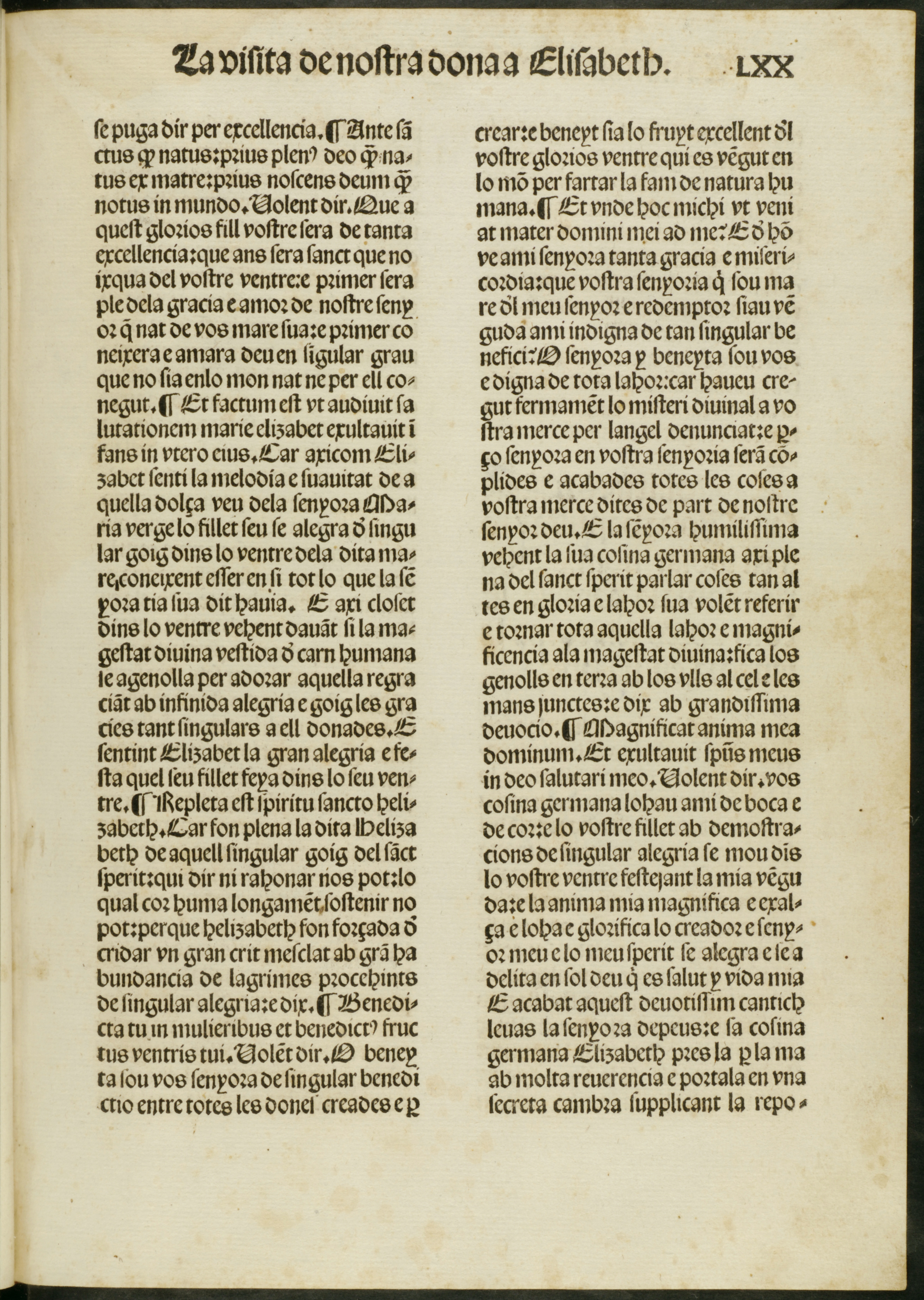 Isabel de Villena, Vita Christi, publicada en Valencia por Lope de la Roqua en 1497 a instancia de Aldonça de Montsoriu, abadesa del monasterio de la Santísima Trinidad, fol. 170r, principio del capítulo dedicado a la visita de la Virgen a su prima santa Isabel.