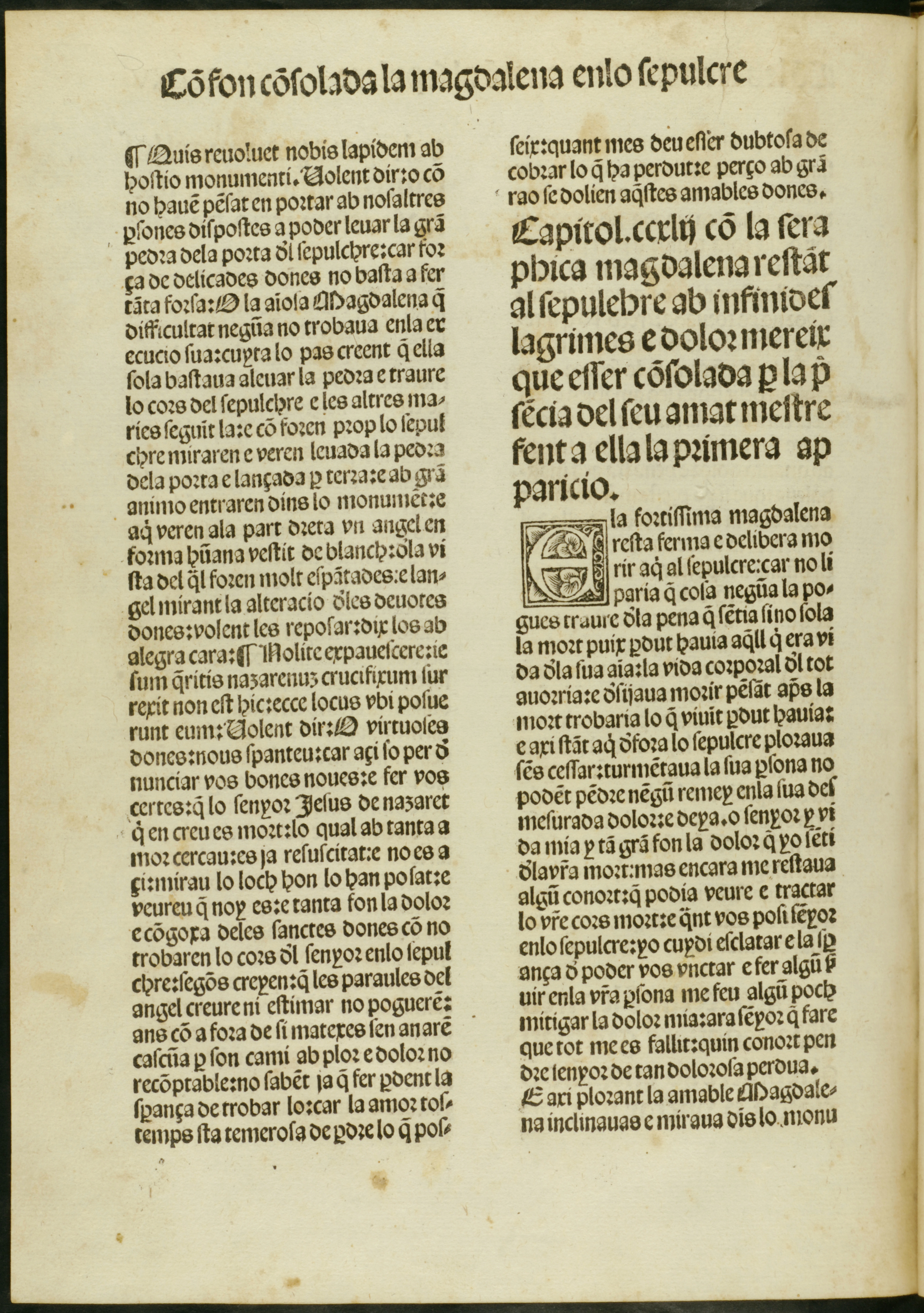 Isabel de Villena, Vita Christi, publicada en Valencia por Lope de la Roqua en 1497 a instancia de Aldonça de Montsoriu, abadesa del monasterio de la Santísima Trinidad, fol. 266r, capítulo dedicado a la aparición de Cristo resucitado a María Magdalena.