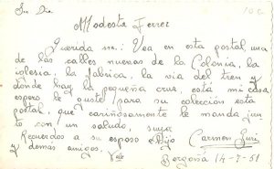 Carta de Carme Guri, treballadora de la Colònia Borgonyà, a Modesta Ferrer, amb data del 14-7-51. Vers de la postal. (Publicat per: http://chimevapor.wordpress.com/2008/12/14/la-colonia-borgonya-en-el-recuerdo/)